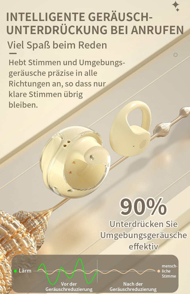 Die innovative Geräuschunterdrückungstechnologie gewährleistet ein entspanntes Hören, indem sie unerwünschte Hintergrundgeräusche effektiv ausblendet. Ganz gleich, ob Sie sich in einem geschäftigen Café oder am Flughafen aufhalten, Ihre Anrufe und Wiedergabelisten bleiben ungestört.